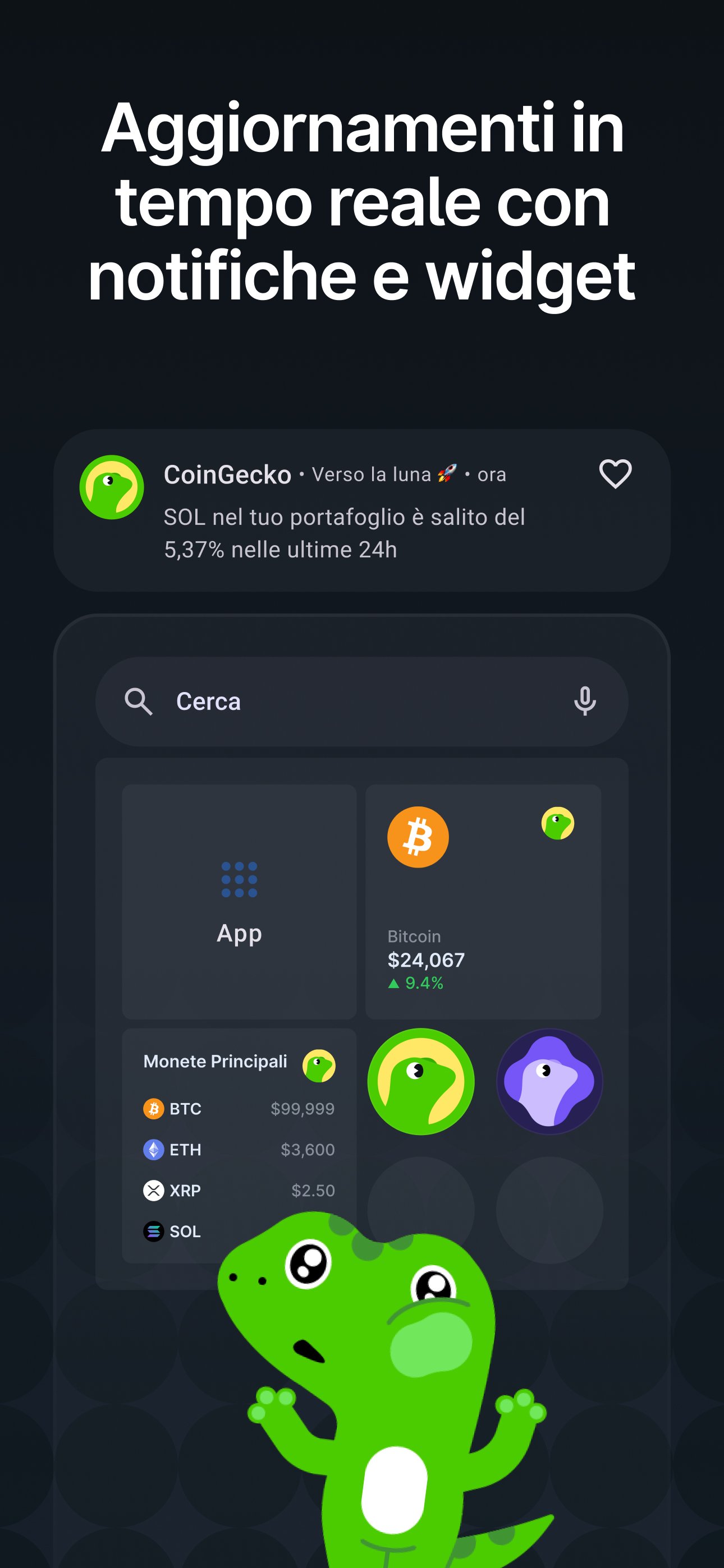 Hai paura di perdereti il prezzo delle tue cripto preferite? Imposta un alert sui prezzi e lascia che la nostra app lavori per te! Contiene anche alert per grandi oscillazioni di prezzo, per cui sarai informato se Bitcoin o Ethereum registrano un movimento importante!