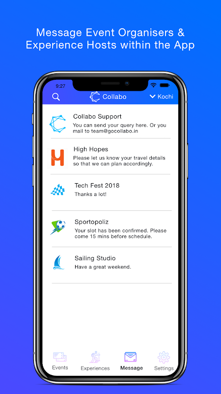 Parla con gli organizzatori di eventi e altre attività direttamente all'interno dell'app Collabo. Questa funzione può essere utilizzata per ordinare prodotti o servizi, assistenza clienti e richieste di informazioni.