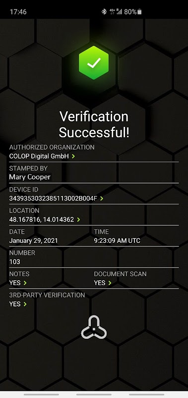 Con questa app di verifica, puoi verificare il sigillo e il suo contesto in pochi secondi. Recupera tutti i seguenti dettagli da un database blockchain: