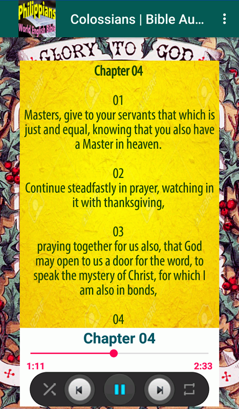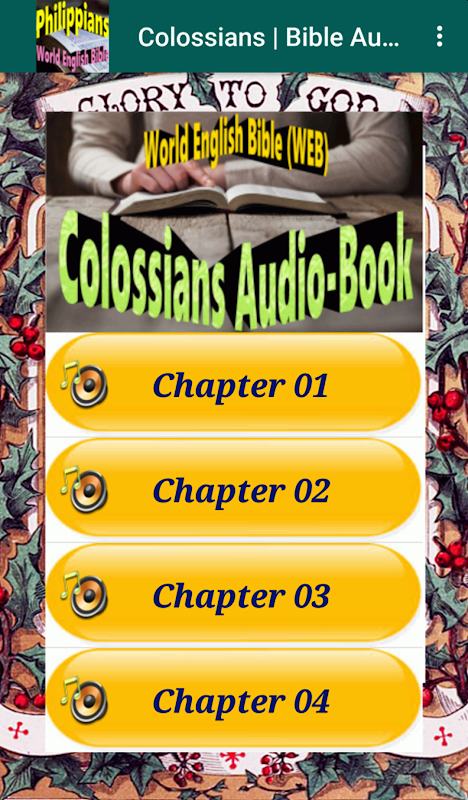 Un'app per chiunque voglia conoscere il cristianesimo direttamente dalla fonte (Bibbia). Goditi il capitolo completo di Colossesi (L'Epistola ai Colossesi) con audio di buona qualità con trascrizione (testo). Goditi la bellezza della parola di Dio sempre e ovunque, anche senza connessione a Internet (offline), tramite il tuo gadget Android. Questa app ti presenta il capitolo completo dei Colossesi basato sulla Bibbia inglese mondiale (WEB). Puoi goderti tutto in modo rapido, semplice e facile. Un must per l'anima cristiana devota.