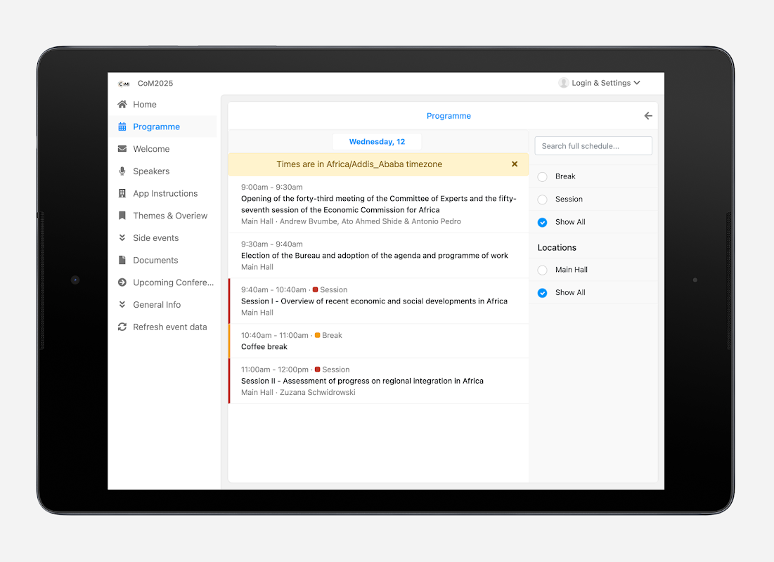 La cinquantasettesima sessione della Commissione Economica per l'Africa consisterà nella riunione preparatoria del Comitato di Esperti della Conferenza dei Ministri africani delle Finanze, della Pianificazione e dello Sviluppo Economico, seguita dalla parte ministeriale della Conferenza. Rimani informato con aggiornamenti in tempo reale su eventuali modifiche o annunci importanti riguardanti la conferenza mentre accedi facilmente a tutte le informazioni sull'evento, inclusi programma, relatori, delegati e documenti. Partecipa attivamente con strumenti interattivi come sessioni di domande e risposte e sondaggi per ottenere il massimo da CoM2025.