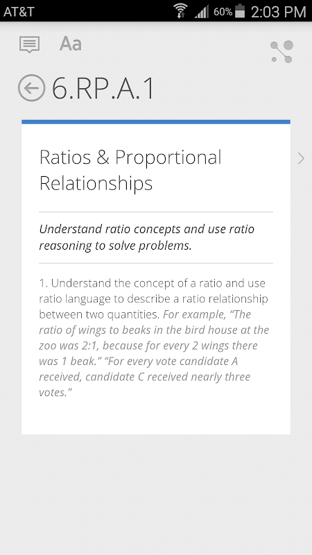 View the Common Core state standards in one convenient FREE app! This app includes a simple way to view each Common Core standard. A great reference for parents and teachers to easily read and understand the core standards. Quickly find standards by subject, grade, and subject category (domain/cluster). This app currently includes Math standards K-12 and Language Arts standards K-12.