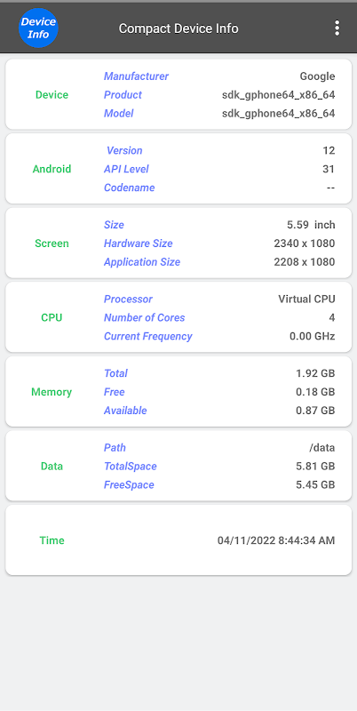 Visualizza le informazioni sul sistema e sull'hardware del dispositivo in un elenco CardView.