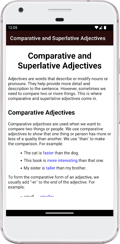 Questa app fornisce una guida completa per aiutare gli studenti a comprendere le diverse forme di aggettivi comparativi e superlativi, insieme ad esempi e regole di utilizzo. L'app presenta un'interfaccia facile da usare, perfetta sia per i principianti che per gli studenti avanzati.