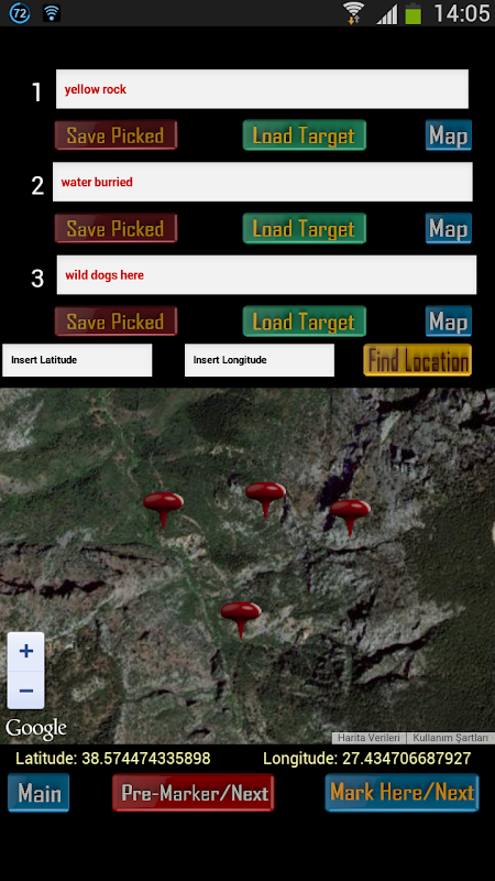 Select “Pre-Marker/Next” Select Name Area>>> Write Your Location by Using Latitude and Longitude Data into “Insert Latitude” and “Insert Longitude” boxes respectively. Data insert format is ex. 34.4567. >>> Click “Find Location Button” >>> Save Picked Location by Pressing “Save Picked” Button.