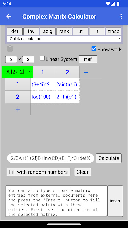 Questo calcolatore scientifico di numeri complessi, calcolatore di matrici complesse, un calcolatore scientifico completamente funzionale per eseguire calcoli su numeri reali, immaginari e, in generale, complessi ed espressioni di matrici. Anche per risolvere sistemi di equazioni lineari eseguendo eliminazioni di Gauss-Jordan su matrici aumentate.