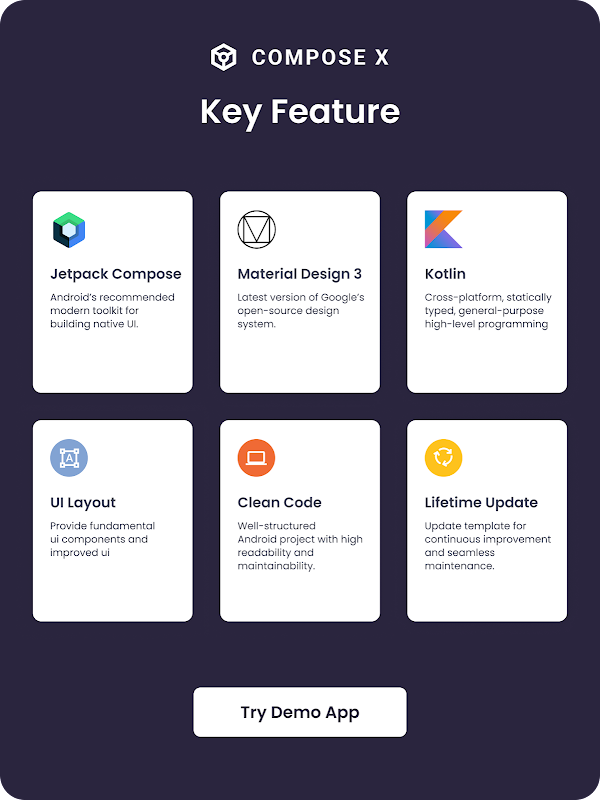 ComposeX è un modello di interfaccia utente che fa risparmiare tempo progettato specificamente per sviluppatori e programmatori Android, realizzato interamente con Jetpack Compose. Questo potente toolkit ti consente di creare straordinarie interfacce utente in una frazione del tempo, mantenendo una base di codice altamente organizzata e strutturata.
