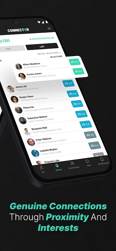 Connector è uno strumento di networking professionale basato su posizione, eventi, profilo e interessi in tempo reale che crea connessioni autentiche, sfruttando le notifiche push e la capacità di ricerca per connettere facilmente le persone attraverso interessi commerciali comuni, dettagli del profilo e obiettivi di carriera. Utilizzando l'intelligenza artificiale, Connector offre un "punteggio valore" di connessione proprietario che identifica il valore di una potenziale connessione, riducendo la quantità di spam riscontrata su altri strumenti di rete professionali.