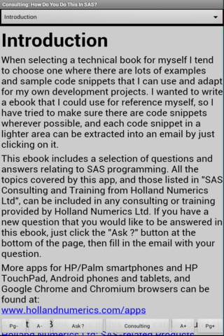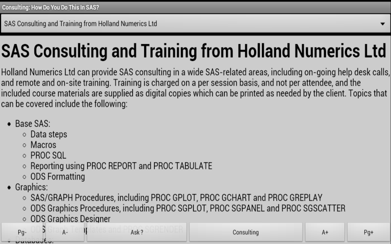 This free app, "Consulting: How Do You Do This in SAS?", is one of a series of eBooks about SAS software programming focusing on frequently asked questions and answers about SAS, illustrated by code samples which can be sent by email directly from the app. It is designed to encourage users to contribute questions some of which will be included in future versions of the app. There are controls to select specific questions, move to the previous or next question, decrease or increase the font to suit the user's preference, and send emails requesting answers to questions not yet included in that version of the eBook.