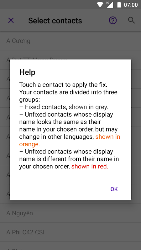 Questa applicazione cerca di risolvere il problema memorizzando i nomi dei contatti sotto il campo Nome Data , in modo che i nomi sono sempre visualizzati correttamente, non importa quale lingua si sceglie. È possibile risolvere singoli contatti selezionandoli in un elenco o correggere tutti i contatti memorizzati sul dispositivo con un solo tocco. Basta ricordarsi di eseguire il backup dei contatti prima!