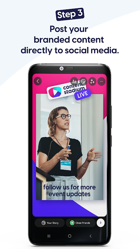 Content Stadium LIVE consente agli utenti di aggiungere rapidamente e facilmente cornici, adesivi e caratteri con il proprio marchio alle storie e ai post sui social media direttamente dai loro telefoni. Perfetto per catturare eventi dal vivo e aggiungere contenuti in movimento.