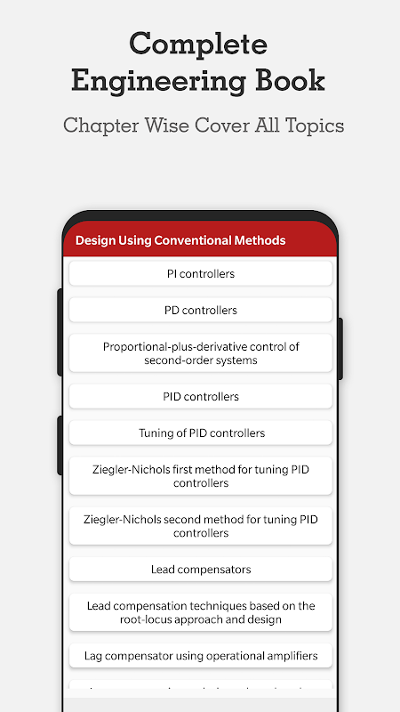 L'app è un manuale gratuito completo di Ingegneria dei sistemi di controllo che copre argomenti importanti, note, materiali del corso. Scarica l'app come materiale di riferimento e libro digitale per programmi e corsi di laurea in Ingegneria del controllo.