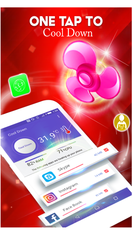 Il dispositivo di raffreddamento del dispositivo per il telefono Android funziona per te in modo perfetto. Dispositivo di raffreddamento intelligente Pulisci la memoria cache, libera la RAM, aumenta la tua memoria fornendo monitoraggio e protezione della temperatura in tempo reale, ottimizza la velocità, la prevenzione del surriscaldamento e il raffreddamento del telefono Android. La caratteristica fondamentale del dispositivo di raffreddamento Android intelligente è la temperatura più bassa. Smart cooler master e il suo algoritmo di minimizzazione del calore sono altamente efficaci.