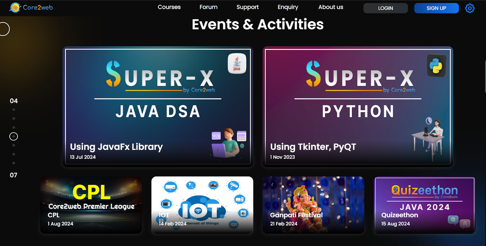 In questa sezione, carichiamo lezioni sui linguaggi di programmazione insegnati da Core2web come C, C++, Java e Python. Inoltre, questa sezione aggiunge un'altra interessante caratteristica di Logic Building, dove i video forniti aiutano l'utente a migliorare la logistica nella programmazione.