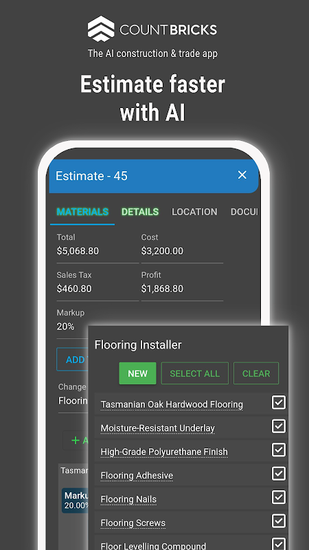 Acquisizioni, fatture, preventivi e ordini di modifica possono essere completati in modo rapido e semplice, risparmiando tempo e fatica. L'app di stima AI ti aiuta anche a collaborare con altri costruttori e commercianti, così potete lavorare insieme per garantire che il lavoro sia finito secondo gli standard più elevati.