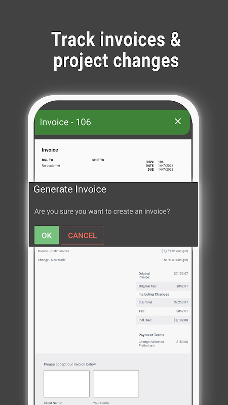 L'app ti consente di archiviare tutti i tuoi preventivi e fatture in un unico posto, dandoti la possibilità di accedere e modificare rapidamente le informazioni per un utilizzo futuro. Puoi anche creare e archiviare una libreria di materiali e costi di manodopera per assicurarti di essere sempre aggiornato con i prezzi più recenti.