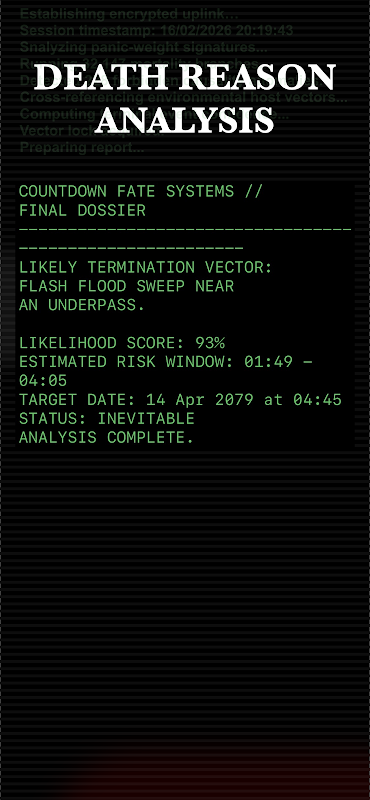Uncover the reason for your death in this chilling new feature. Explore various dark and mysterious causes behind your inevitable fate, adding a layer of depth and narrative to your Countdown experience. What will your fate be? Discover the truth behind your demise with each new countdown.