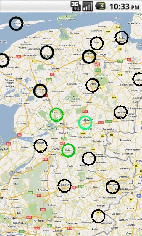 The antennas are drawn as black circles and are located in the province of Friesland, Groningen, Drenthe, Overijssel and Gelderland.