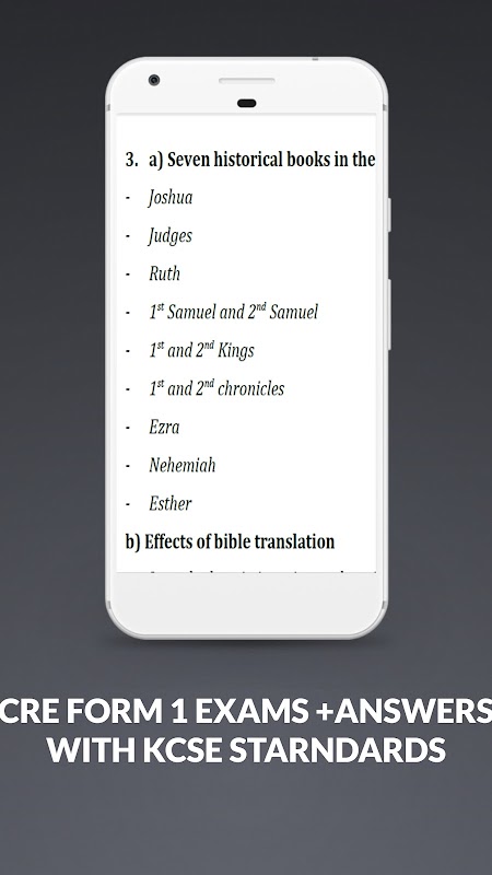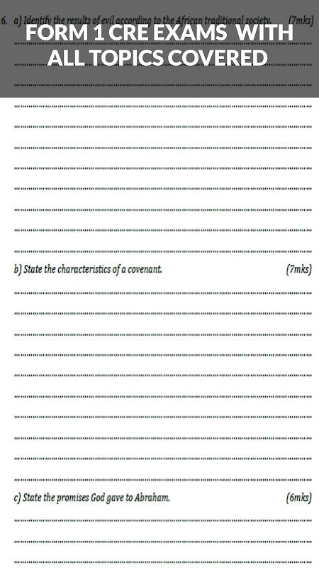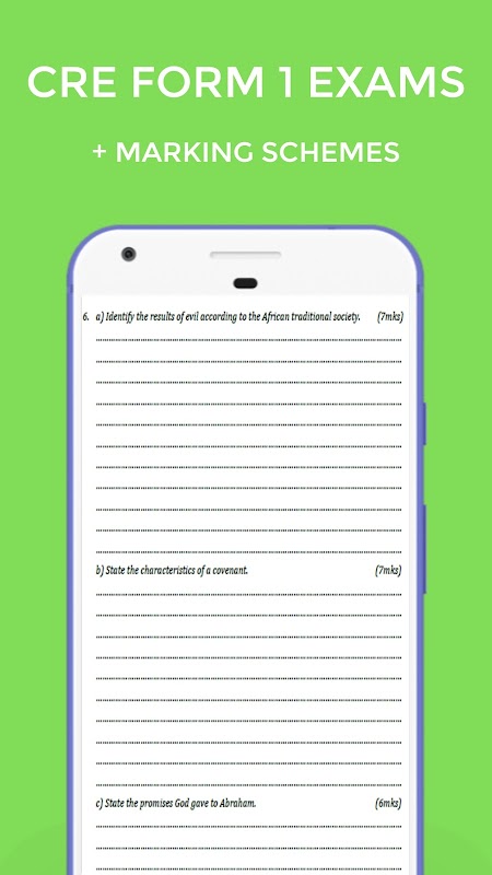 Questa applicazione rende disponibili gli esami del modulo 1 cre che sono degli standard kcse che sono stati organizzati in modo trimestrale, ovvero il termine 1 e il termine 2 e il termine 3 e ogni esame ha uno schema di valutazione che può essere utilizzato per contrassegnare quell'esame