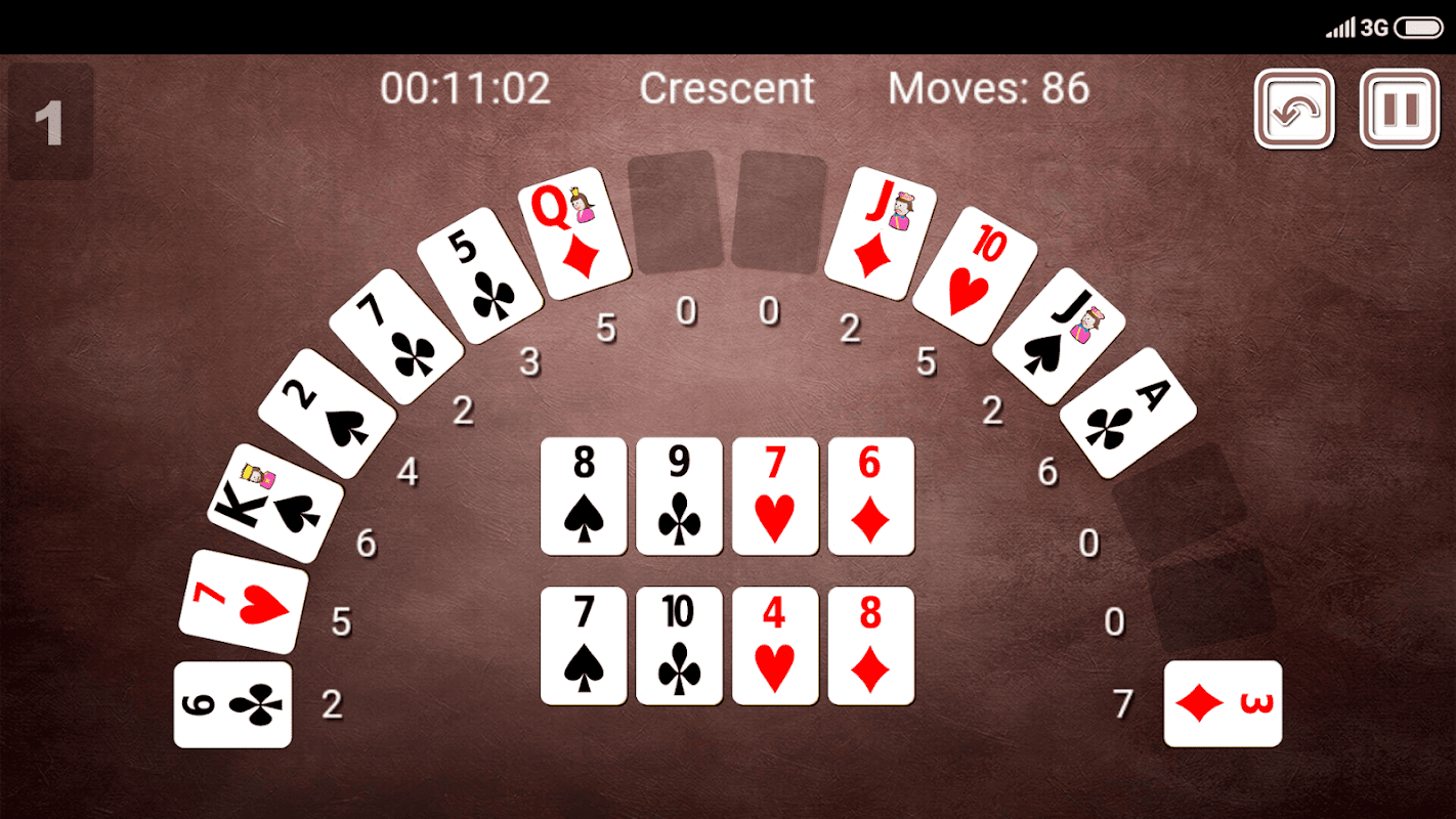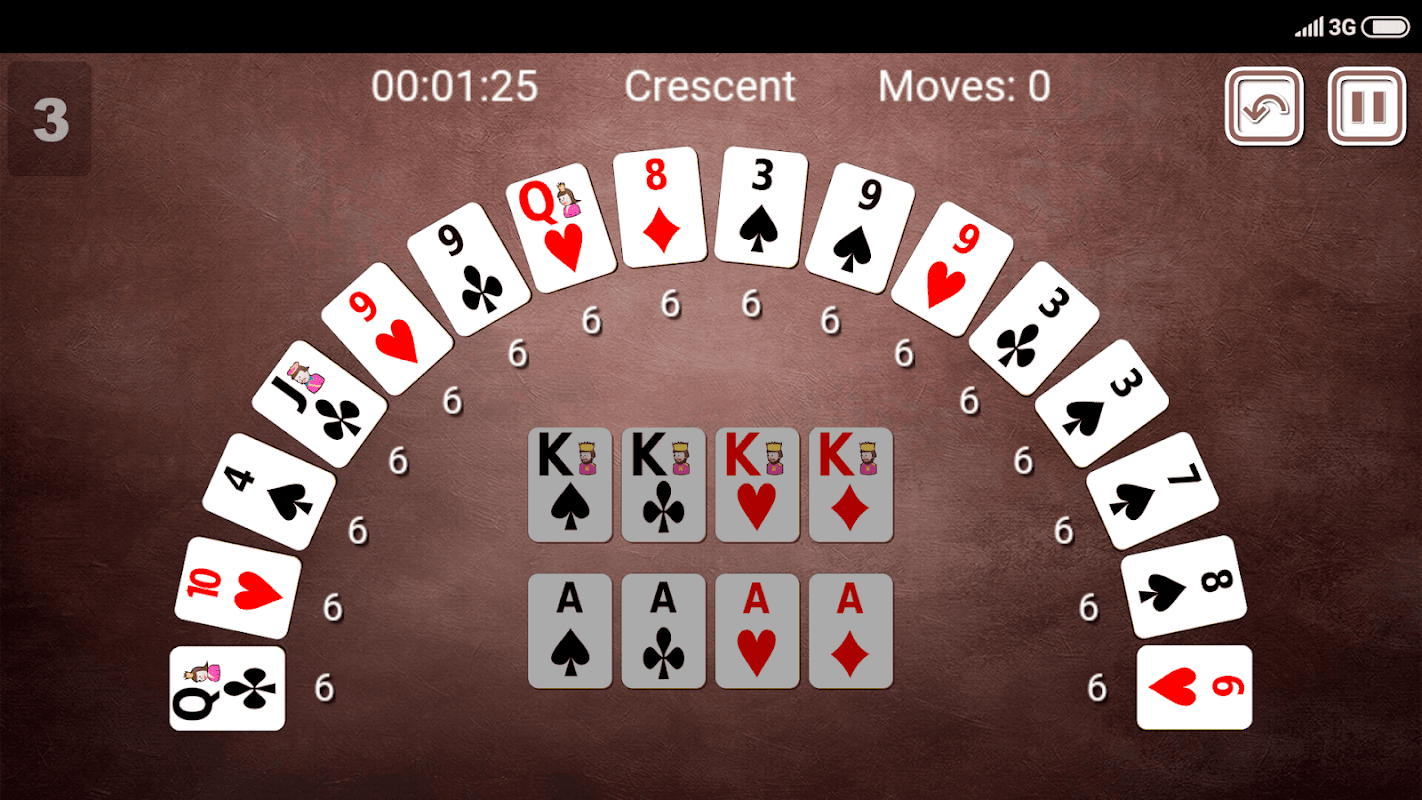 La pila a mezzaluna vuota non può essere riempita con nessuna carta. Le carte delle pile di fondazione possono anche essere spostate su una pila di mezzaluna o di fondazione.