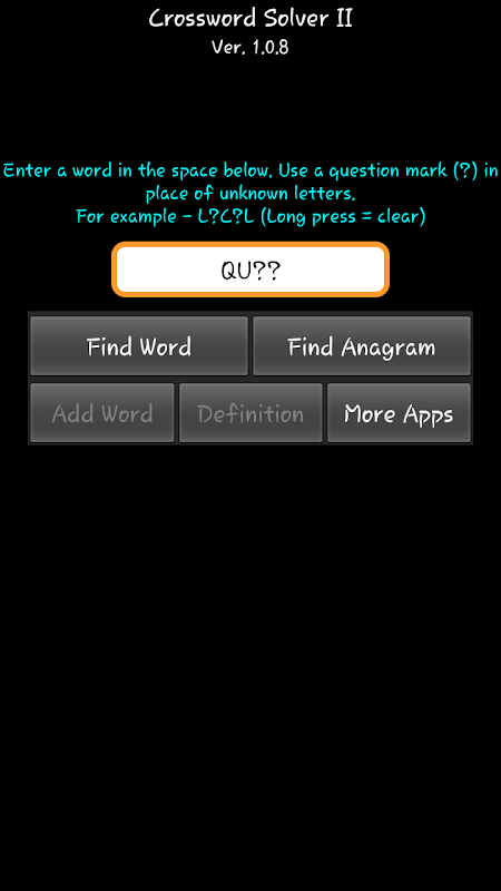 Add missing words to the database. Newly added words are verified, and once verified, will become available to all app users. For obvious reasons, only words that don't contain missing letters, can be added to the database.
