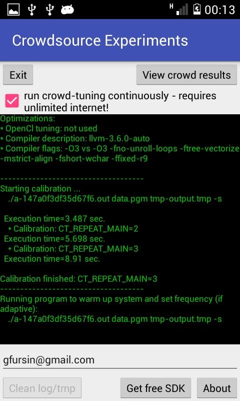 Con l'aiuto del cTuning fondazione senza scopo di lucro, abbiamo sviluppato questo open source della tecnologia conoscenza collettiva (CK) per lasciare che i carichi di lavoro di condivisione della comunità, set di dati, strumenti e flussi di lavoro sperimentali in un formato CK aperto via GitHub o BitBucket, crowdsourcing esperimenti attraverso numerosi dispositivi forniti da volontari, classificano le soluzioni al volo (apprendimento attivo), applicare l'analisi predittiva, scambio di conoscenze e di riprodurre i risultati. I nostri attuali scenari sperimentali condivisi tra cui GCC e LLVM sintonizzazione compilatore bandiera, e abbiamo intenzione di aggiungere la sintonizzazione automatica OpenCL / CUDA, test di scalabilità, rilevamento compilatore bug e analisi di stabilità numerica (vedere il rapporto interattivo CK-based: http://cknowledge.org/ interattivo-relazione)! Questa applicazione interroga semplicemente qualsiasi server CK pubblico disponibile, ottiene pacchetto sperimentale per il dispositivo (come ad esempio diversi binari di un punto di riferimento condiviso con diverse ottimizzazioni), corre sul vostro dispositivo mobile con alcuni dati casuali set e inviare le statistiche di nuovo al server CK ad essere trattati con un apprendimento attivo e analisi predittiva.
