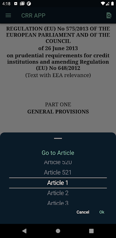 L'App CRR consente di visualizzare facilmente il REGOLAMENTO (UE) N. 575/2013 DEL PARLAMENTO EUROPEO E DEL CONSIGLIO del 26 giugno 2013 sui requisiti prudenziali per gli enti creditizi e le imprese di investimento e che modifica il Regolamento (UE) N. 648/2012.