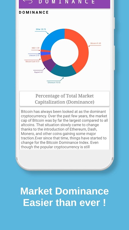 Crypto Data application only fetches news from top sources like Techcruch, CoinDesk, CryptoCoinNews, CNBC etc, which ensure our reader that news is authorized. Market Dominance is another thing that quite important for us as a trader to know.