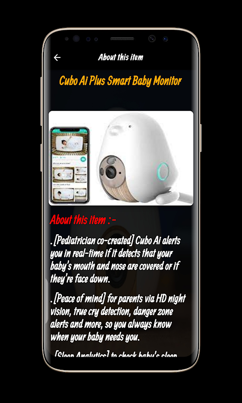 L'applicazione Cubo Ai Plus Camera Guide contiene molte informazioni e specifiche per la Cubo Ai Plus Camera, che puoi visualizzare in modo chiaro e semplice. La Cubo Ai Plus Camera è un baby monitor, quindi ora puoi essere rassicurato riguardo al tuo bambino durante il sonno grazie alla Cubo Ai Plus Camera che è collegata al tuo telefono cellulare