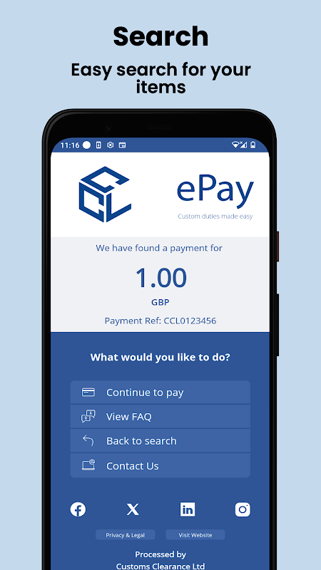 L'app Customs ePay è un'applicazione indipendente sviluppata e gestita da CCL. Tieni presente che Customs ePay non è affiliato o approvato da alcun ente governativo.
