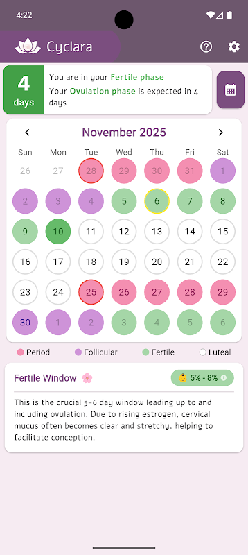 • Previsione intelligente: l'algoritmo di Cyclara diventa più intelligente nel tempo, fornendo previsioni estremamente accurate per il tuo prossimo ciclo mestruale e il periodo fertile.