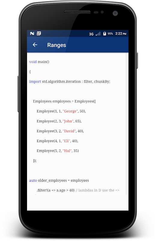 ► Questa applicazione è progettata per tutte quelle persone che sono alla ricerca di un punto di partenza di apprendimento D Lingua. Sia un principiante o gli utenti avanzati possono fare riferimento questa applicazione come il loro materiale didattico. gli studenti possono fare riferimento Entusiasti come loro riferimento on-the-go lettura. Un individuo con mentalità logica può godere di apprendimento D attraverso questo App.✦