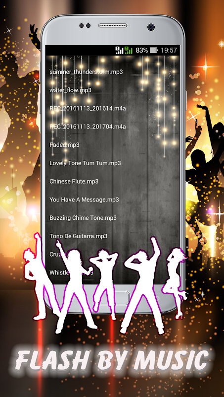 Dance Disco Flashlight will turn on or turn off your camera flash by amplitude of audio file, so you can use your camera flashlight as a disco light.