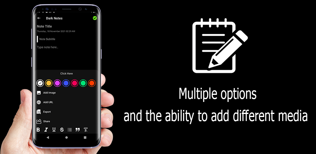 أستمتع بالكثير من الخصائص علي الكتابة وإمكانية إضافة الوسائط المختلفة ، كما يمكنك الإختيار من بين الألوان الرائعة لتلوين النوتة الخاصة بك وتمييزها بألوان مختلفة ، وأخيراً وليس أخراً يمكنك الحفاظ علي ملاحظاتك السرية بعيداً عن أعين المتطفلين من خلال حمايتها برمز خاص