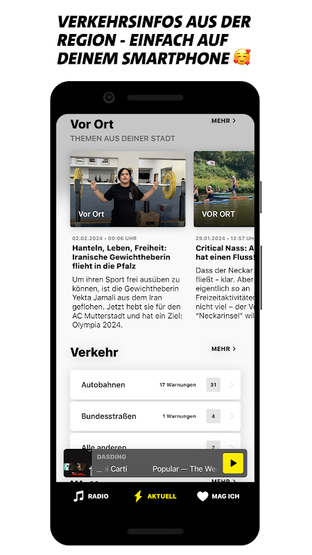Ascolta in streaming e scopri i tuoi suoni completamente gratuitamente con l'app DASDING, ascolta la radio senza pubblicità e ricevi tutte le canzoni dal programma dal vivo da ascoltare sul tuo smartphone o tablet - quando vuoi e tutte le volte che vuoi! Con la nostra nuova app, ascoltare la radio è più divertente che mai!