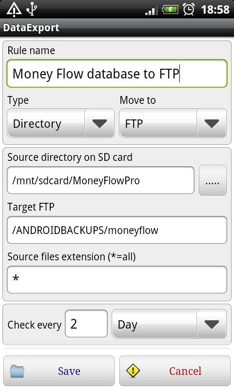 - add a name to your new rule, select the type of source (File, Directory, SMS), select the target type (Move to: E-mail, FTP, SD card), select the source and target path (to select a directory, tap and hold the item), and the occurence (Check every: x-minute, hour, day, month). Save the rule.