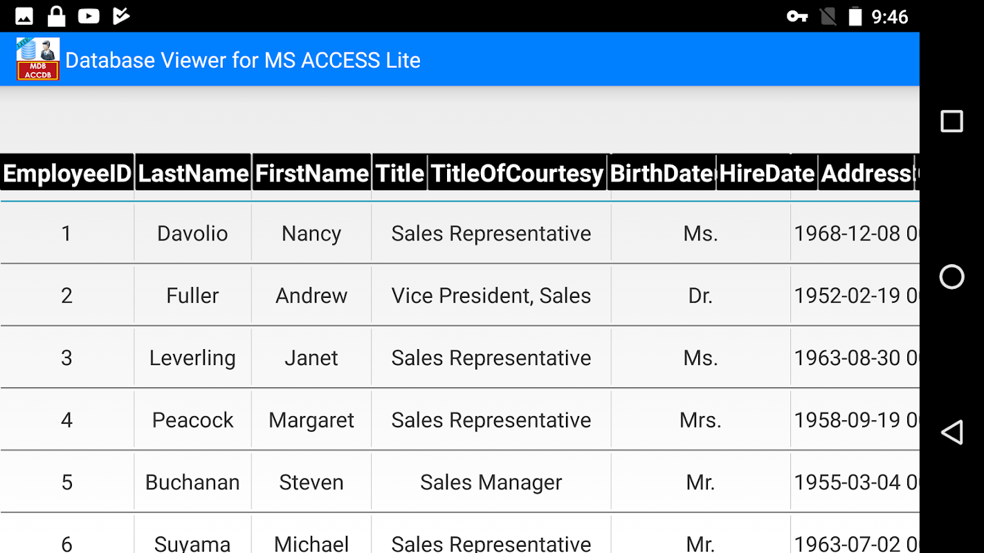 Visualizza MS Access tabella del database e dei dati di query (vista) sul proprio dispositivo Android.
