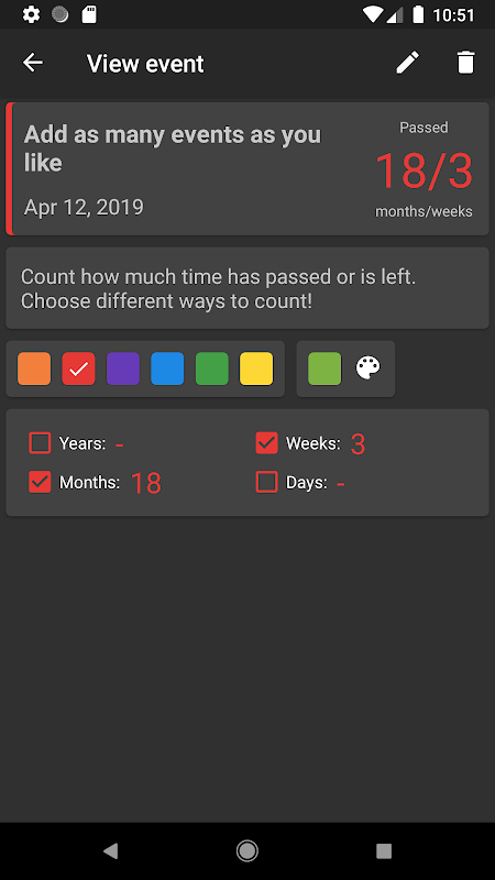 • Calcolo del tempo trascorso o rimanente in giorni, settimane, mesi, anni o tutti insieme per tenere traccia dei tuoi eventi futuri o passati