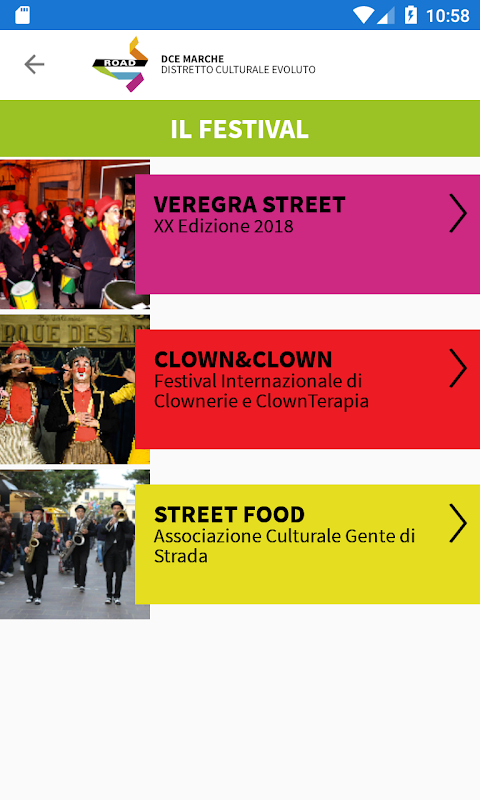 Nasce da questa consapevolezza ROAD: Festival, arti, mestieri e il patrimonio culturale delle strade del fermano, un progetto del Distretto Culturale Evoluto, promosso dalla Regione Marche, che ha una forte componente innovativa in quanto si sviluppa principalmente nell’interazione con le nuove tecnologie (dal digital signage alla realtà aumentata, per arrivare ad una cartografia partecipativa). È sostenuto dai Comuni di Montegranaro, Pedaso, Monte San Giusto, Porto San Giorgio e Campofilone. Insieme alle pubbliche amministrazioni anche numerose aziende ed associazioni locali: Dmp Concept, Esserci Comunicazione, Grottini, Jef, Marca Fermana, PluService, Si2G e l’Università Politecnica delle Marche.