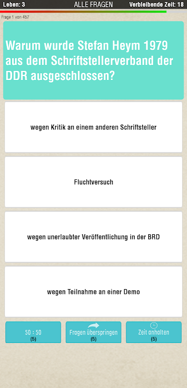 Quanto conosci la DDR? Mostra ed espandi le tue conoscenze nel quiz DDR. Ti aspettano oltre 500 domande di varie categorie, come vita quotidiana, geografia, film e televisione, storia, musica, tecnologia, sport e molto altro. Sta a te decidere se desideri che le tue conoscenze siano testate solo in determinate categorie o se preferisci rispondere a un colorato mix di tutte le domande.