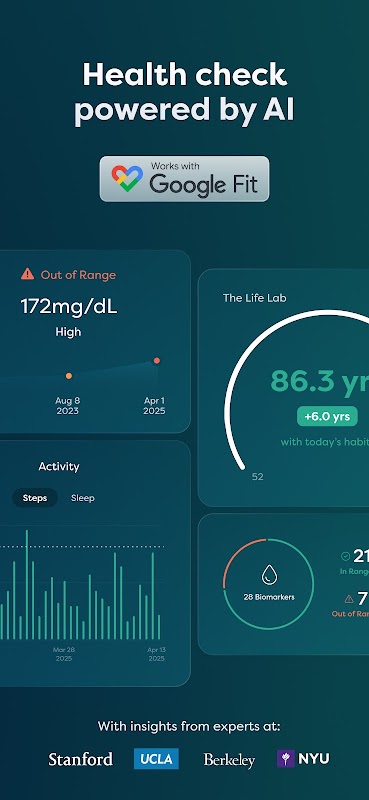 Life Lab trasforma i tuoi dati sanitari in un piano personalizzato per la longevità. Il tuo consulente sanitario basato sull'intelligenza artificiale ti guida in ogni fase: analizzando le analisi del sangue, ottimizzando le abitudini e monitorando i progressi man mano che la tua aspettativa di vita si evolve in tempo reale.