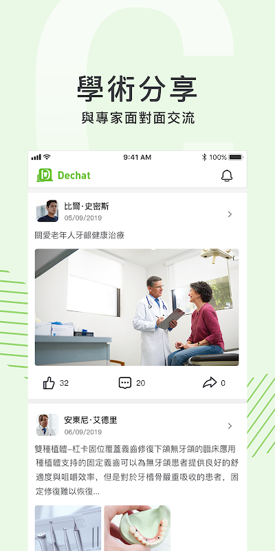 Dechat是一個可以接觸世界各地牙醫大師的平臺,可以在平臺上進行互動交流學習,並查看最新資訊。