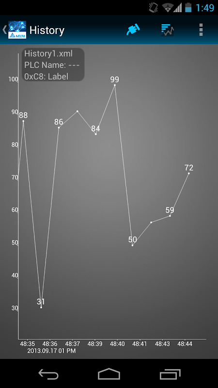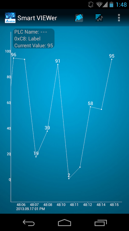 With Delta Smart VIEWer, Users can monitor and edit PLC and Modbus data via Wifi. With the monitored data shown in run charts, users can easily and quickly master the current status and recorded trends of the equipment for proper on-site adjustment.