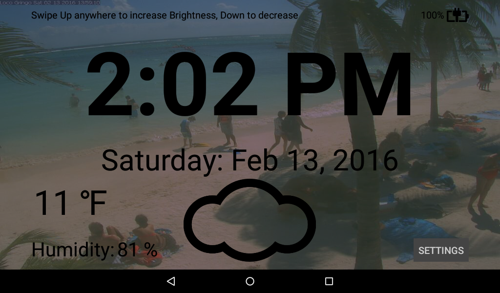 La versione 1.5 è stato un importante aggiornamento. Gli utenti possono ora modificare lo sfondo di un'immagine, la selezione di un'immagine locale dal dispositivo, o un'immagine Internet URL (ad esempio webcam mi piace: http://107.170.253.177/akumal/netcam-0.jpg). Condizioni atmosferiche attuali vengono ora visualizzati come bene (richiede servizi di localizzazione abilitato). Inoltre, ha aggiunto funzionalità di allarme (utilizzando di default fornitore di allarme Android).