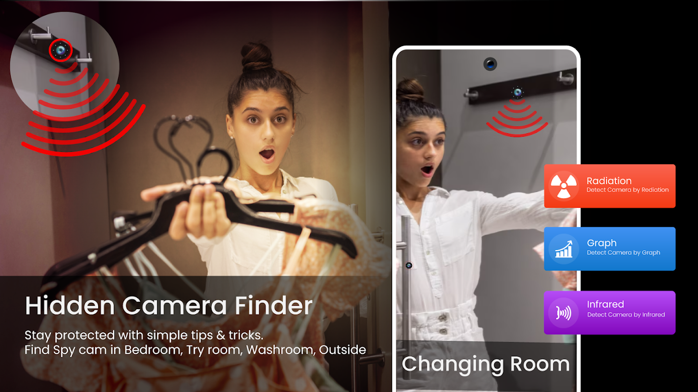 Hidden Camera Detector può facilmente sostituire un gadget serio per proteggere la tua privacy e trovare dispositivi nascosti. Hidden Device Camera Detector funziona come dispositivo di rilevamento e rilevamento di telecamere e telecamere in metallo e funziona al meglio rilevando materiali ferromagnetici come telecamere nascoste, altoparlanti e altri tanti dispositivi spia. Questo cercatore di telecamere spia è un'app per la ricerca di dispositivi spia che ti aiuterà a individuare qualsiasi dispositivo a infrarossi in qualsiasi stanza o spazio. Trova qualsiasi microfono nascosto, dispositivi spia, quadrooter, IR Cam, intercettazioni telefoniche o dispositivi di localizzazione GPS. Il cercatore di telecamere nascoste può individuare le webcam Airbnb o qualsiasi tipo di dispositivo spia.