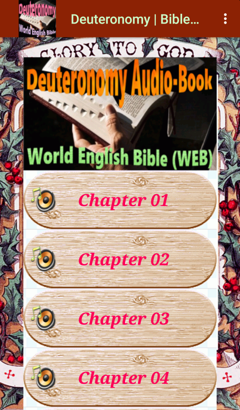 An app for anyone who want to know about Christianity directly from the source (Bible). Enjoy Complete chapter of Deuteronomy (The Book of Deuteronomy) in good quality audio with transcript (text). Enjoy the beauty of God's word anytime and everywhere -- even without internet connection (offline) -- via your Android gadget. This app presents you the complete chapter of Deuteronomy based on World English Bible (WEB). You can enjoy it all in quick, simple, and easy way. A must for devoted Christian soul.