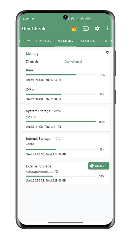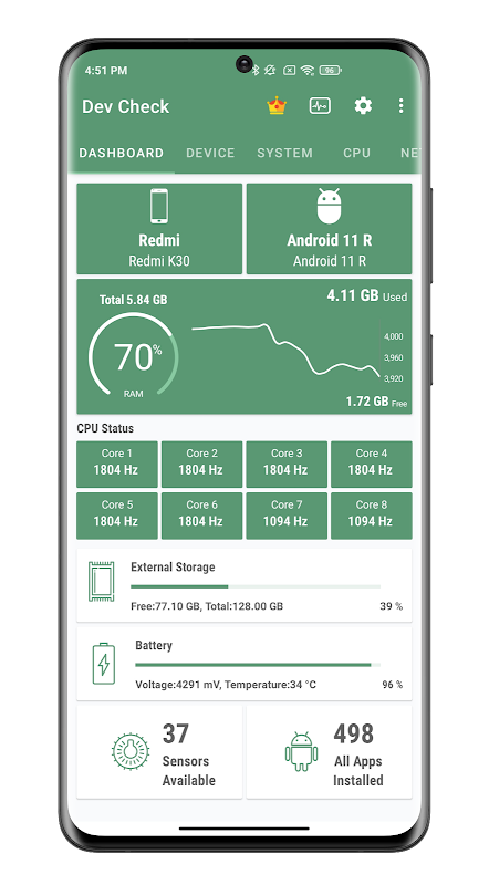 Dev Check è un'applicazione Android semplice e potente che ti fornisce informazioni complete sul tuo dispositivo mobile con interfacce utente avanzate. Dev Check include informazioni su CPU, RAM, sistema operativo, sensori, memoria, batteria, SIM, Bluetooth, rete, app installate, app di sistema, display, fotocamera, termica, monitor galleggiante, ecc.
