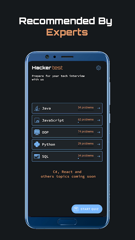 Impara i principi di codifica, espandi le tue conoscenze. Il 70% degli studenti di Informatica (CS) apprezza l'idea di questa app e molti ingegneri del software utilizzano Hacker Test (domande di colloquio tecnico) per prepararsi al colloquio.