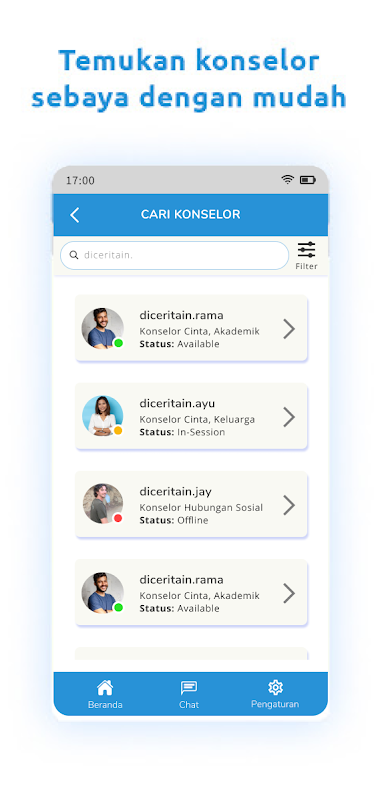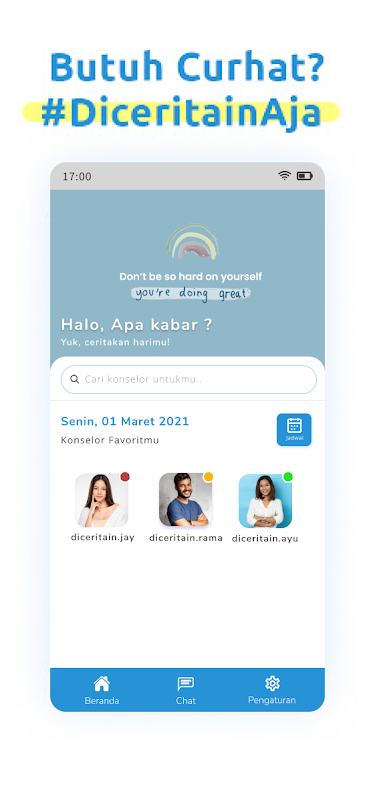 Bercerita dengan konselor sebaya tersertifikasi dan terpercaya.