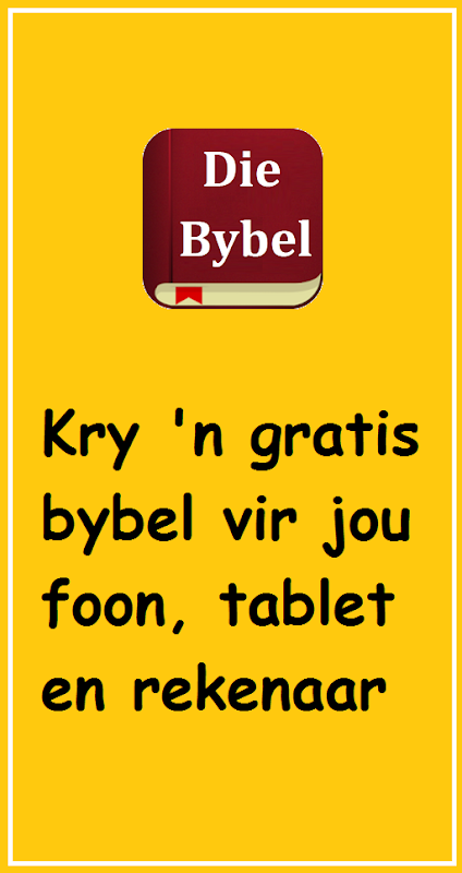 U kan nou die Bybel in Afrikaans geniet, gratis op u selfoon om enige tyd, enige plek te lees. Om die Bybel te lees is ‘n goeie gewoonte en dit bring u nader aan God. Moenie ‘n oomblik langer wag nie, kry die Afrikaanse Bybel gratis sodat u u gunsteling verse elke dag kan lees en die leringe ted eel met u vriende en geliefdes. Onthou dat God u altyd sal lief hê, begeleidend wees op u pad en Hy sal altyd na u omsien. Moet nooit alleen of hulpeloos voel nie, volg Sy woord en u sal die lig aan die einde van die tonnel sien. Word elke oggend wakker en lees verse van Sy Heilige Boek en u sal sien hoe u dag heeltemal verander.